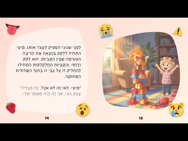 גוני הִתְיַשֵּׁב עַל הַשָּׁטִיחַ וְחִלֵּק אֶת הַקֻּבִּיּוֹת בְּצִפִּיָּה גְּדוֹלָה. כְּשֶׁהַמִּגְדָּל נַעֲשָׂה גָּבוֹהַּ מִדַּי, הוּא קָרַס בְּרַעַשׁ — וְאָז הִגִּיעַ הָרַעֲיוֹן הַמָּתוֹק וְהַלֹּא צָפוּי שֶׁיָּכוֹל לְשַׁנּוֹת הַכֹּל. עִם כַּפִּית, צִנְצֶנֶת תּוּתִים וְחָתוּל סַקְרָן בְּשֵׁם מִיצֵי, גוני לוֹמֵד{לוֹמֶדֶת} שֶׁגָּבוֹהַּ לֹא תָּמִיד צָרִיךְ לִהְיוֹת מָהִיר: לִפְעָמִים צָרִיךְ סַבְלָנוּת, תִּכְנוּן וַאֲפִלּוּ נִקָּיוֹן שֶׁל הַקֻּבִּיּוֹת. סִפּוּר מָלֵא הוּמוֹר, רֶגֶשׁ וּלְקָחִים קְטַנִּים לִילָדִים גְּדוֹלִים.