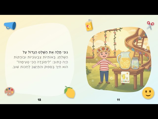 גוני פֶּתַח דּוּכָן קָטָן בְּלֵב גַּן הַשַּׁעֲשׁוּעִים — עִם קַנְקַן לִימוֹנָדָה צוֹנֶנֶת וְשֶׁלֶט צִבְעוֹנִי. אַף־אֶחָד לֹא עָצַר, עַד שֶׁאִשָּׁה זְקֵנָה עָצְרָה לִטְעֹם, וְשָׁם, בִּלְגִימָה אַחַת, הַכֹּל הִשְׁתַּנָּה. הַצִּלְצוּל שֶׁל הַמַּטְבְּעוֹת הִשְׁלִים אֶת הַחֲלוֹם: מַתָּנָה עֲנָקִית לְכָל הַחֲבֵרִים בַּגַּן. סִפּוּר חַם עַל אֹמֶץ קָטָן, נְדִיבוּת גְּדוֹלָה וְהַכּוֹחַ שֶׁל לְחַיֵּךְ וּלְהַאֲמִין.